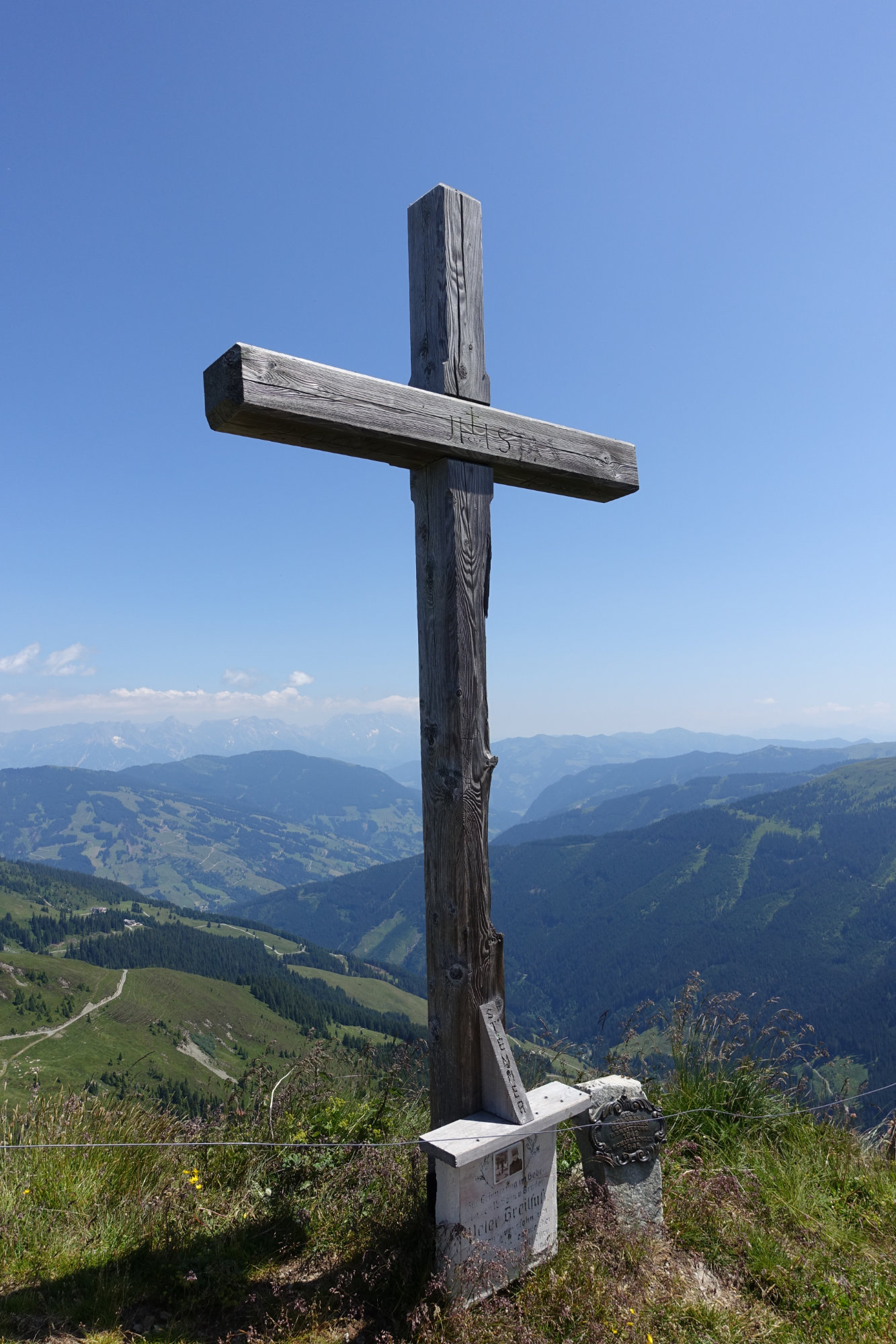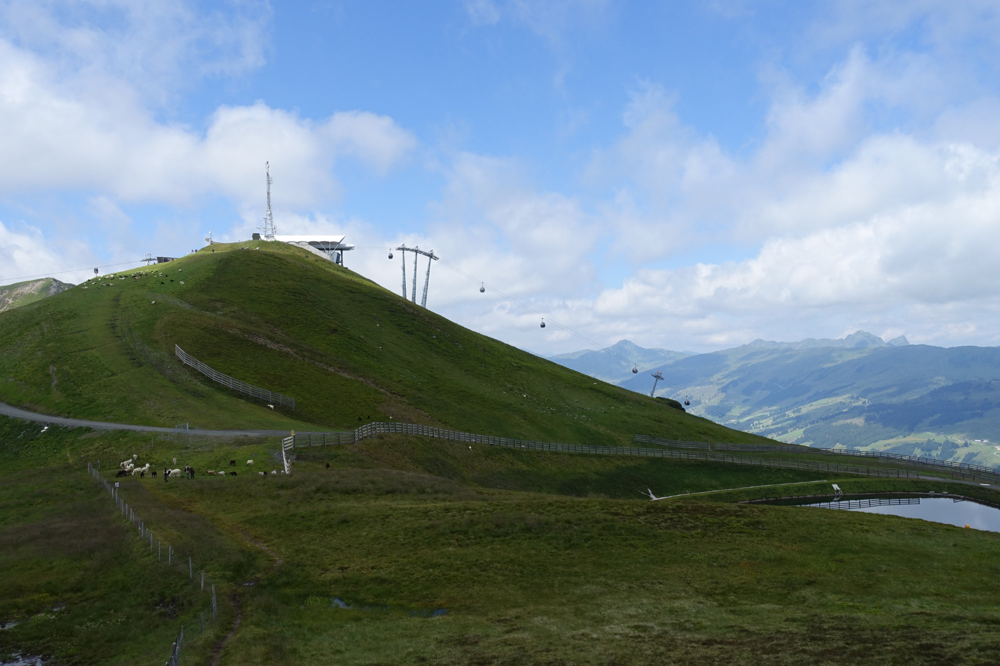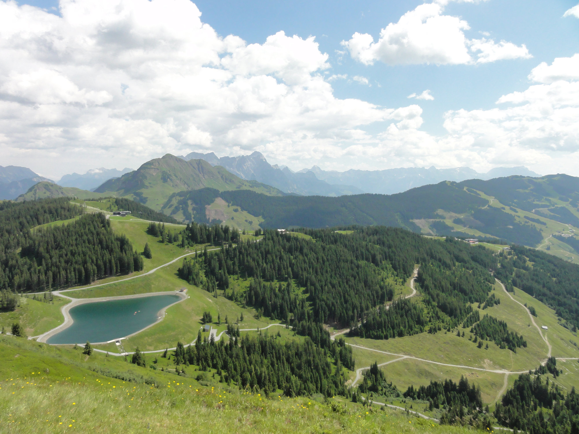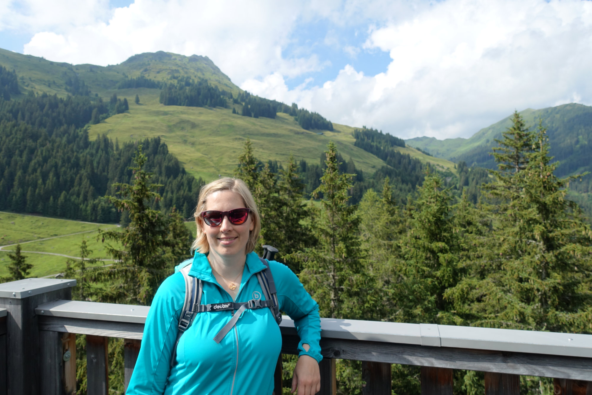 Nachdem wir die obligatorischen Gipfelfotos gemacht haben, sind wir dann wieder abwärts gewandert. Dabei geht es über eine Wiese auf der anderen Seite des Wetterkogels Richtung Wetterkreuz und Speicherteich (ausgeschildert). In Schlangenlinien hat es sogar unsere damals noch einjährige Tochter an der Hand den Wiesenweg runtergeschafft. Danach geht es weiter talwärts an der Reiteralm und Sonnalm vorbei. Von beiden Almen aus kann man wieder zur Reiterkogel Bergstation laufen, oder man steigt über den Unterreitweg bis nach Hinterglemm ab.