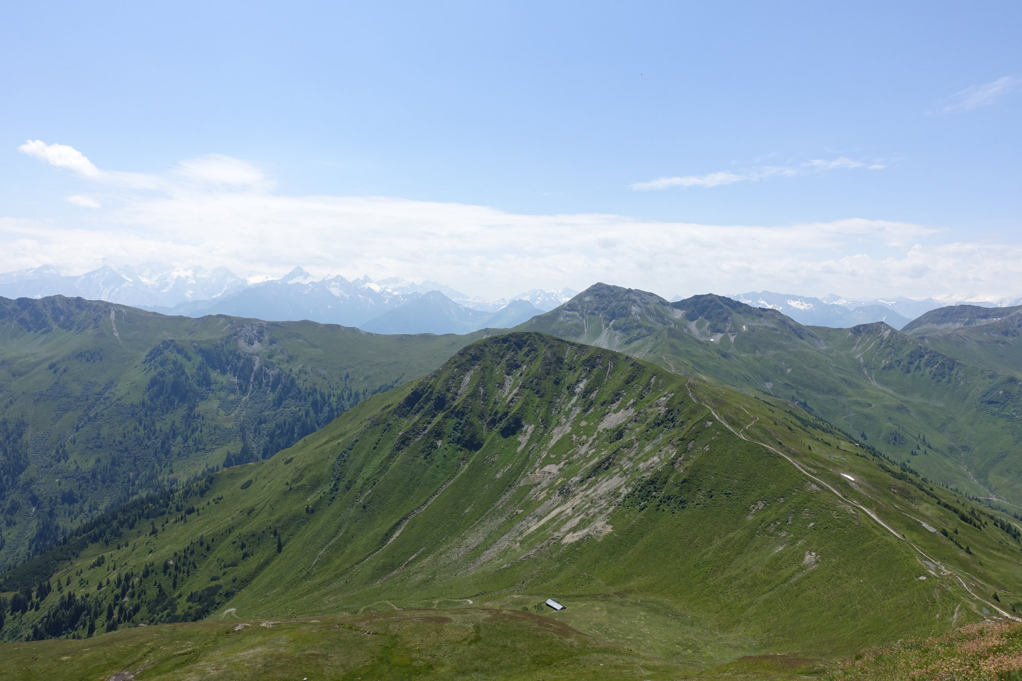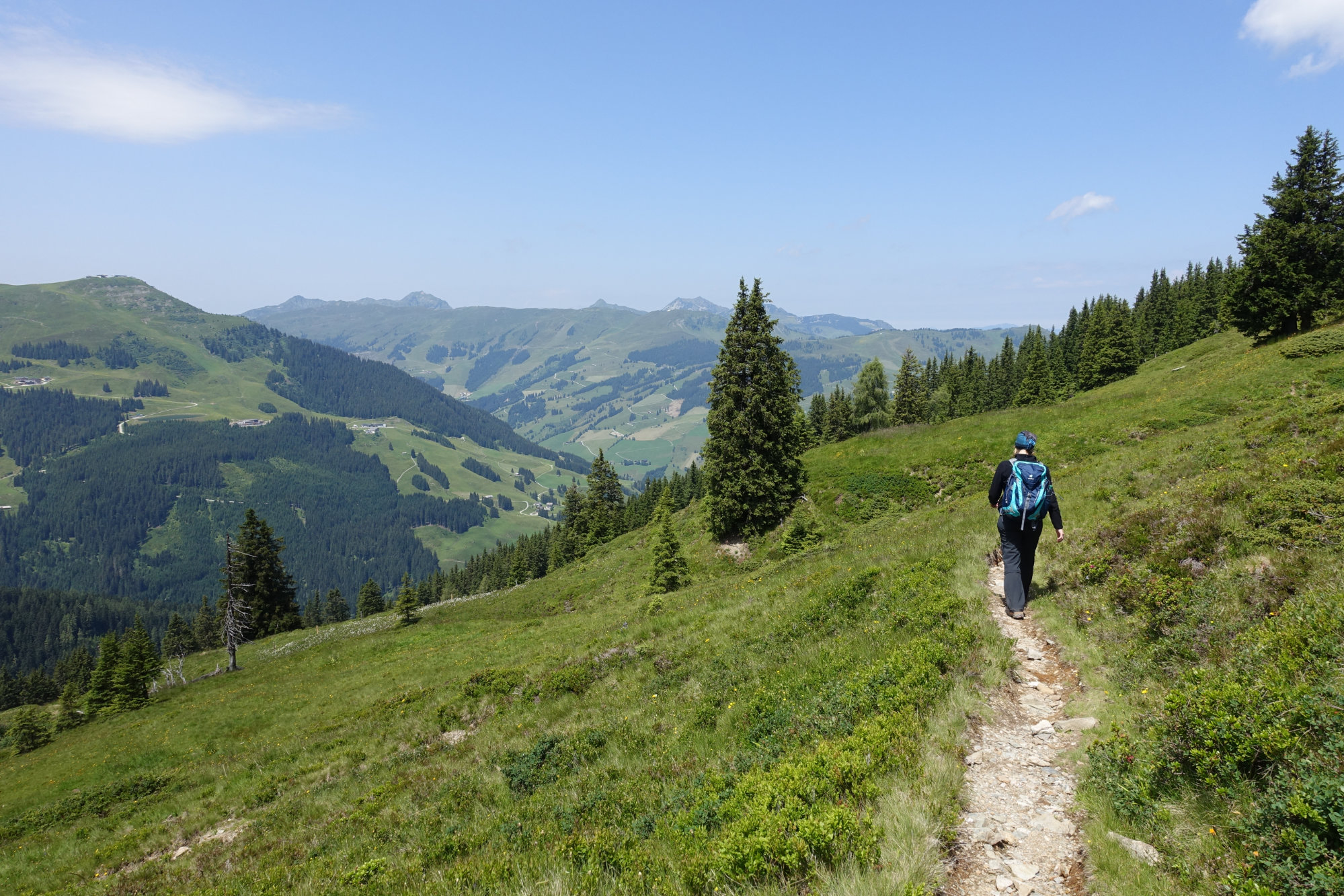 Vom Schattberg West (bzw. nach dessen Umrundung) kann man schon den Stemmerkogel als nächsten Gipfel sehen. Erst nochmal wieder runter und dann gleich wieder hoch wandert man dann auf schönen Pfaden. Ein bisschen kraxelig und felsig wird es dann kurz vor dem Gipfel des Stemmerkogels, aber auch mit Kraxe ist die Strecke gut machbar, Kindern macht gerade die Kraxelei sehr viel Spaß. Wir haben Anfang Juli sogar noch etwas Schnee gefunden, zur großen Freude des Töchterchens. Vom Gipfel geht es erst steil, dann sanfter wieder runter Richtung Saalbachkogel. Ca. in der Mitte zwischen den beiden Gipfeln geht dann ein Weg nach rechts ab, ausgeschildert zur Hacklbergeralm (geradeaus geht der Pinzgauer Spaziergang weiter). Die dann folgende Strecke ist aus unserer Sicht der schönste Teil der Tour: In Schlangenlinien geht es sanft abwärts durch Hänge voller Buschwerk und Blumen, während man die Aussicht über’s Glemmtal genießen kann.