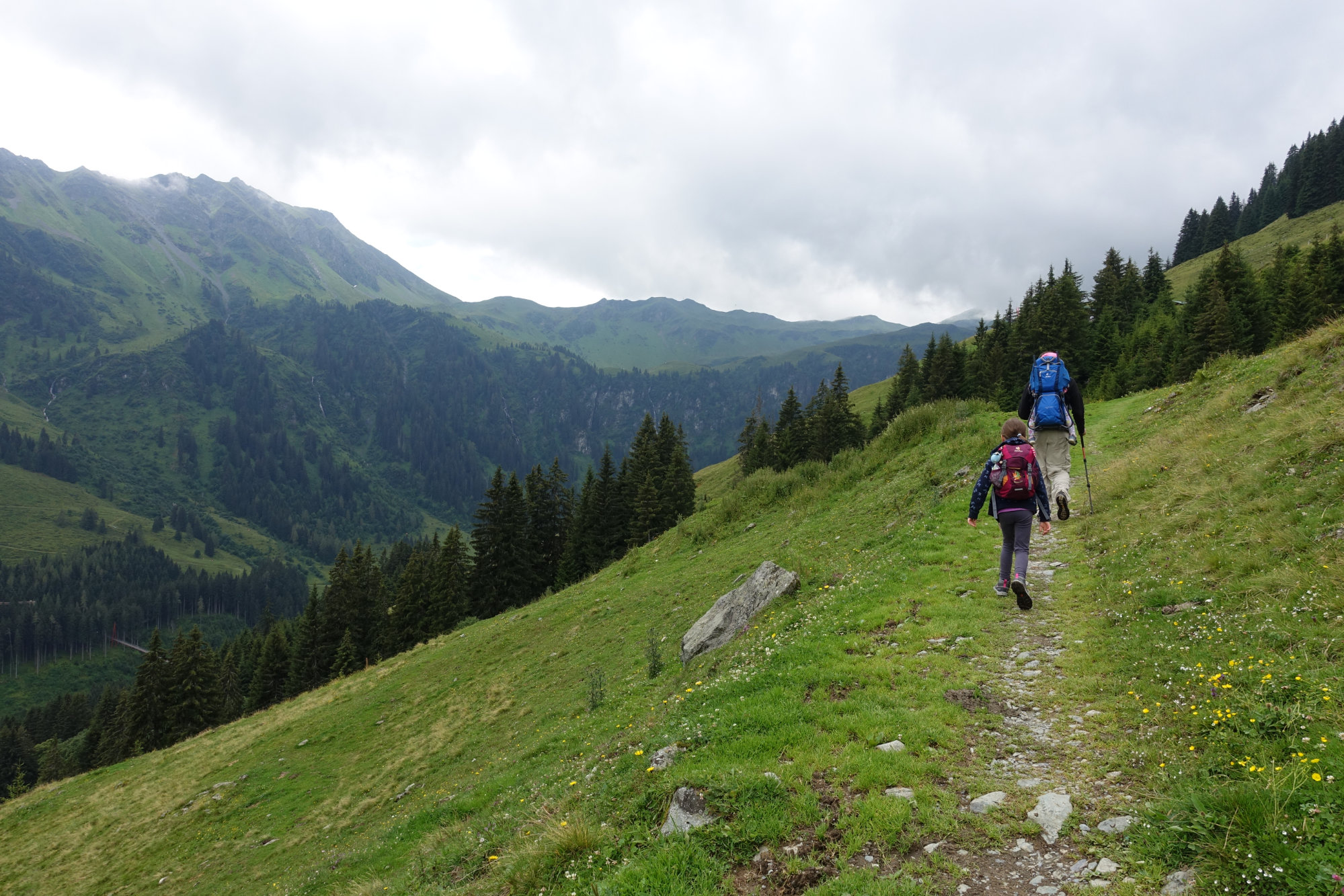 Erstmal geht es den Berg etwas runter in Richtung des neuen Spielplatzes (eröffnet Juli 2018). Damit haben wir Anreize für das Ende der Rundwanderung gesetzt: gespielt wird dort erst, wenn wir zurück sind. Direkt am Spielplatz geht es nach links auf den Floraweg. Es folgt ein wirklich schöner Wanderpfad, erst mit herrlicher Aussicht auf dem Grat entlang, dann durch Büsche, Blumen und Bäume hangabwärts. Wir haben viel Spaß auf dem Weg nach unten zur Limbergalm. Ab der Limbergalm geht es dann bergauf auf einer Schotterstraße. Und diese Schotterstraße zieht sich wirklich hin. Irgendwann kann man dann den Schattberg Ostgipfel wieder gut sehen, ab da stieg die Motivation dann wieder etwas. Am Wegesrand gab es ein paar Kühe, Miniwasserläufe und Autos/Quads, die uns mit hoher Geschwindigkeit überholt haben.