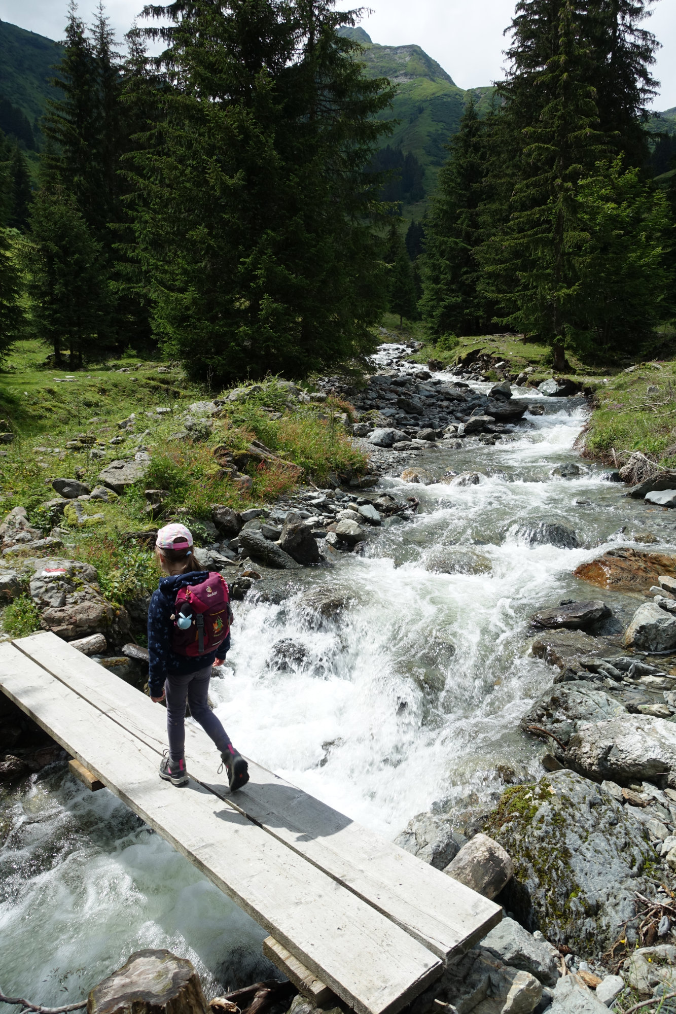 Los geht es am Talschluss Parkplatz (Busstation Lengau). Eine Informationstafel gibt dort eine Übersicht über diesen Rundwanderweg. Während die Massen auf die Bimmelbahn warten oder den direkten Wanderweg zu den Talschluss-Attraktionen wählen, biegen wir nach rechts ab. Zunächst führt ein Schotterweg bergauf. Entlang des Wegs gibt es viele kleine Highlights, wie Bäche und Miniwasserfälle, einen Aussichtshochsitz, Blumen am Wegesrand. Insgesamt ist es aber der langweiligste Teil der Tour, und wir mussten der großen Tochter gut zureden, doch weiterzugehen. Die Kleine hat in der Kraxe die Aussicht genossen. Nach einem langen Stück Schotterstraße beginnt endlich der richtige Wanderweg, und ab da macht es richtig Spaß. Wanderpfade mit Wurzeln und Steinen, und vor allem ganz viel Wasser, das den Berg runterkommt. In den Tagen zuvor hat es stark geregnet, und der Wasserstand ist hoch. Größere Wasserläufe können auf Brücken überquert werden, aber an vielen Stellen mussten wir über’s Wasser hüpfen und klettern. Teilweise wurde der Wanderweg selber zum Bach, und wir sind auf den Berghang ausgewichen. Die große Tochter hat voller Begeisterung einen sprudelnden Wasserfall nach dem anderen fotografiert. Bei so viel Ablenkung merkt man gar nicht, dass wir immer noch in den Bergen auf und ab wandern.