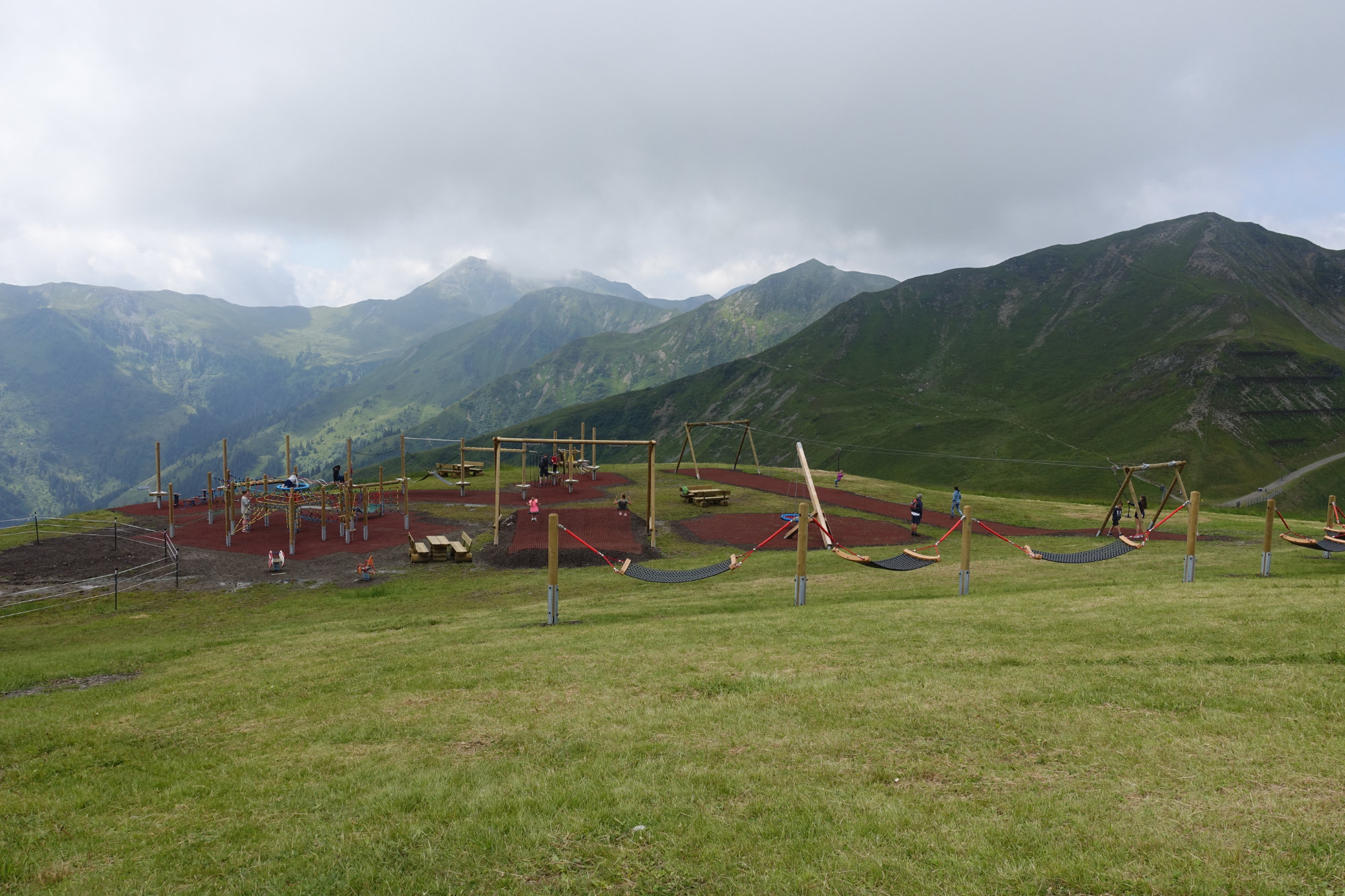 Als kleiner Ausflug bietet sich der Zwölferkogel in Hinterglemm an. Los geht es an der Bergstation. Dort haben wir erstmal an der Snapshot-Anlage ein Familienfoto gemacht (gar nicht so einfach, wenn man nicht lauter andere Leute drauf haben will …). Dann durften wir Eltern die Aussicht genießen, während die Kinder den Spielplatz unsicher gemacht haben. Der ist wirklich grandios, kann aber erst ab ca. 5 Jahren voll erklettert werden.
