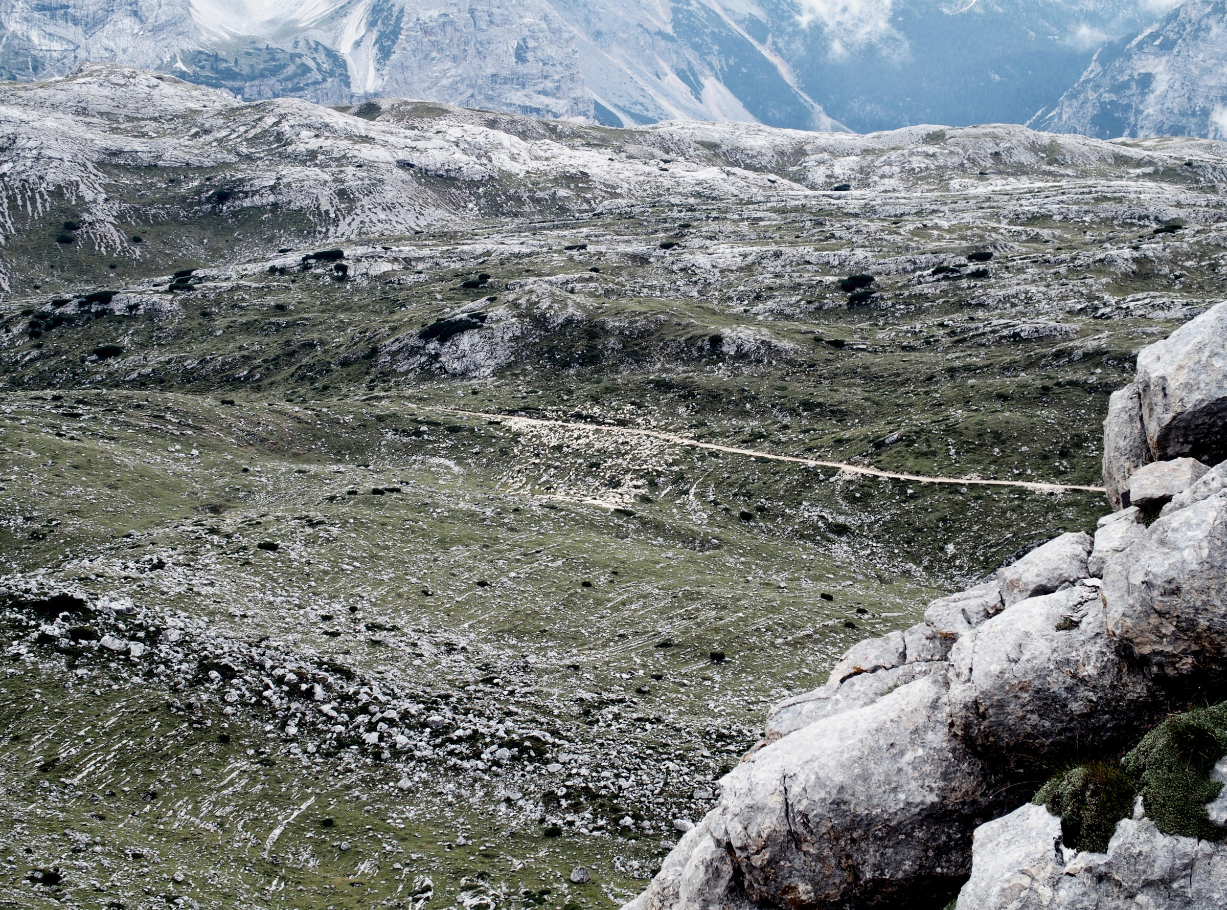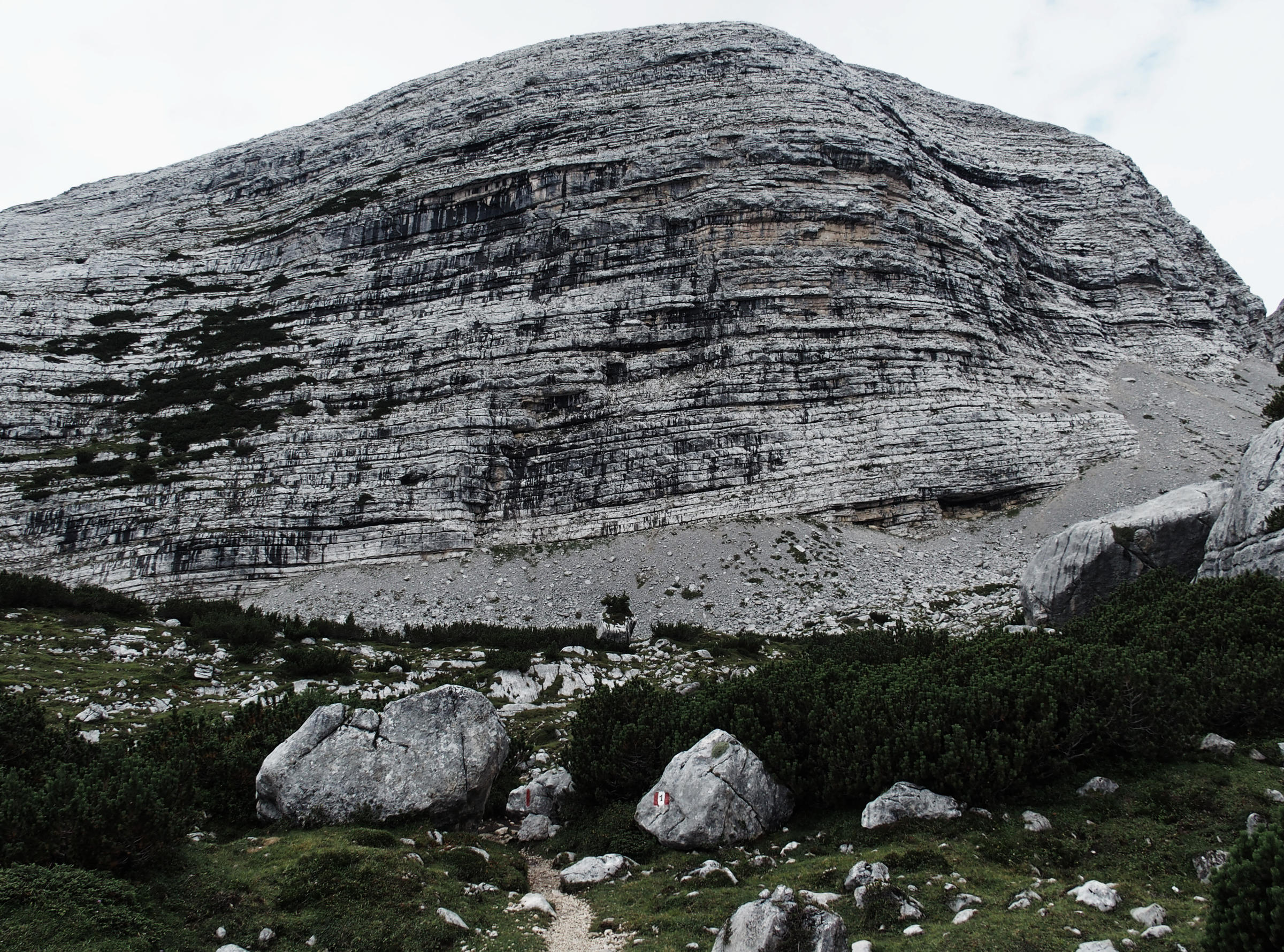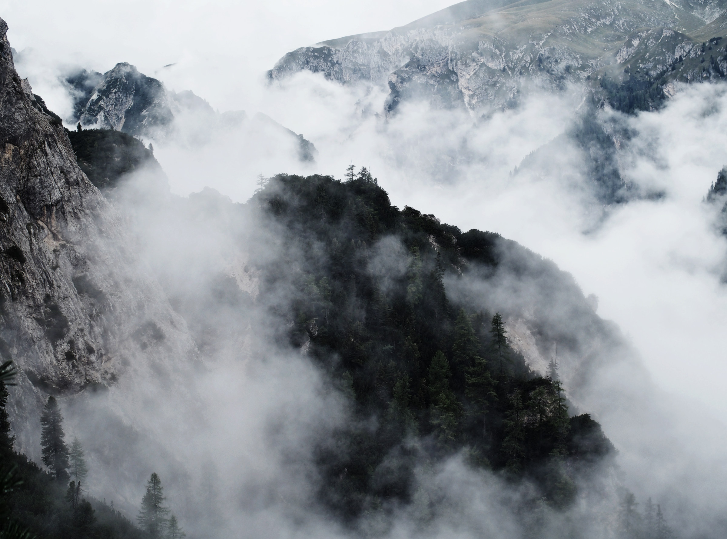 Aber mein Ziel für heute ist natürlich nicht nur der See, sondern der Seekofel. Ich kann ihn nur schemenhaft durch die Wolken sehen, aber da oben, mehr als 1300 Höhenmeter über mir, ist irgendwo ist der Gipfel. Auf der gegenüberliegenden Seite vom Hotel Pragser Wildsee zweigt der Wanderpfad zum Seekofel ab. Nicht viele Leute sind hier unterwegs, aber einige überholen mich auf den drei Stunden Aufstieg zum Gipfel. Der Aufstieg ist anstrengend und ich bin immer wieder außer Puste. Dass ich meinen Körper in den letzten 8 Wochen auf zwei Alpenüberquerungen trainiert habe scheint er vergessen zu haben. Aber dafür wird die Wanderung immer besser, je höher ich komme, die Sicht auf den Pragser Wildsee ist wunderschön mit den Wattewolken.