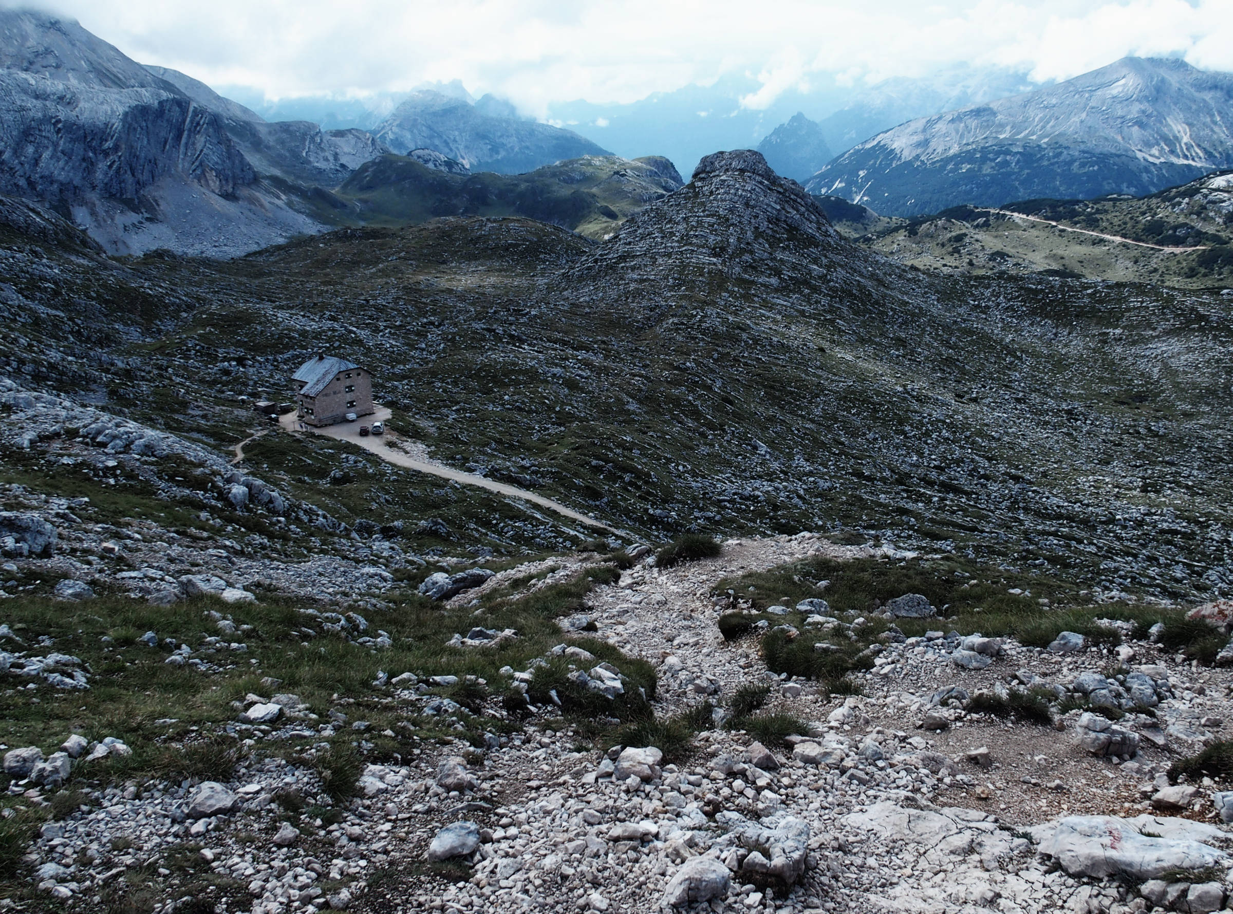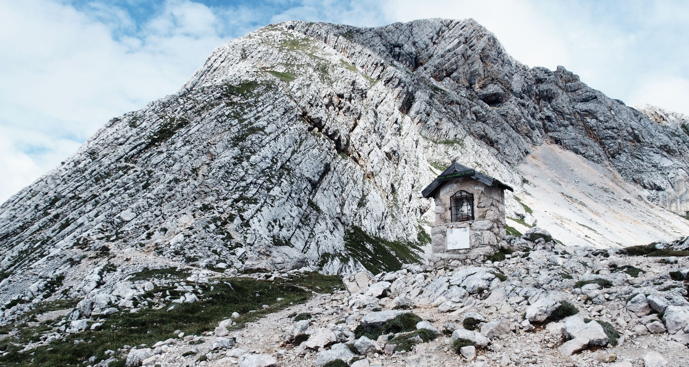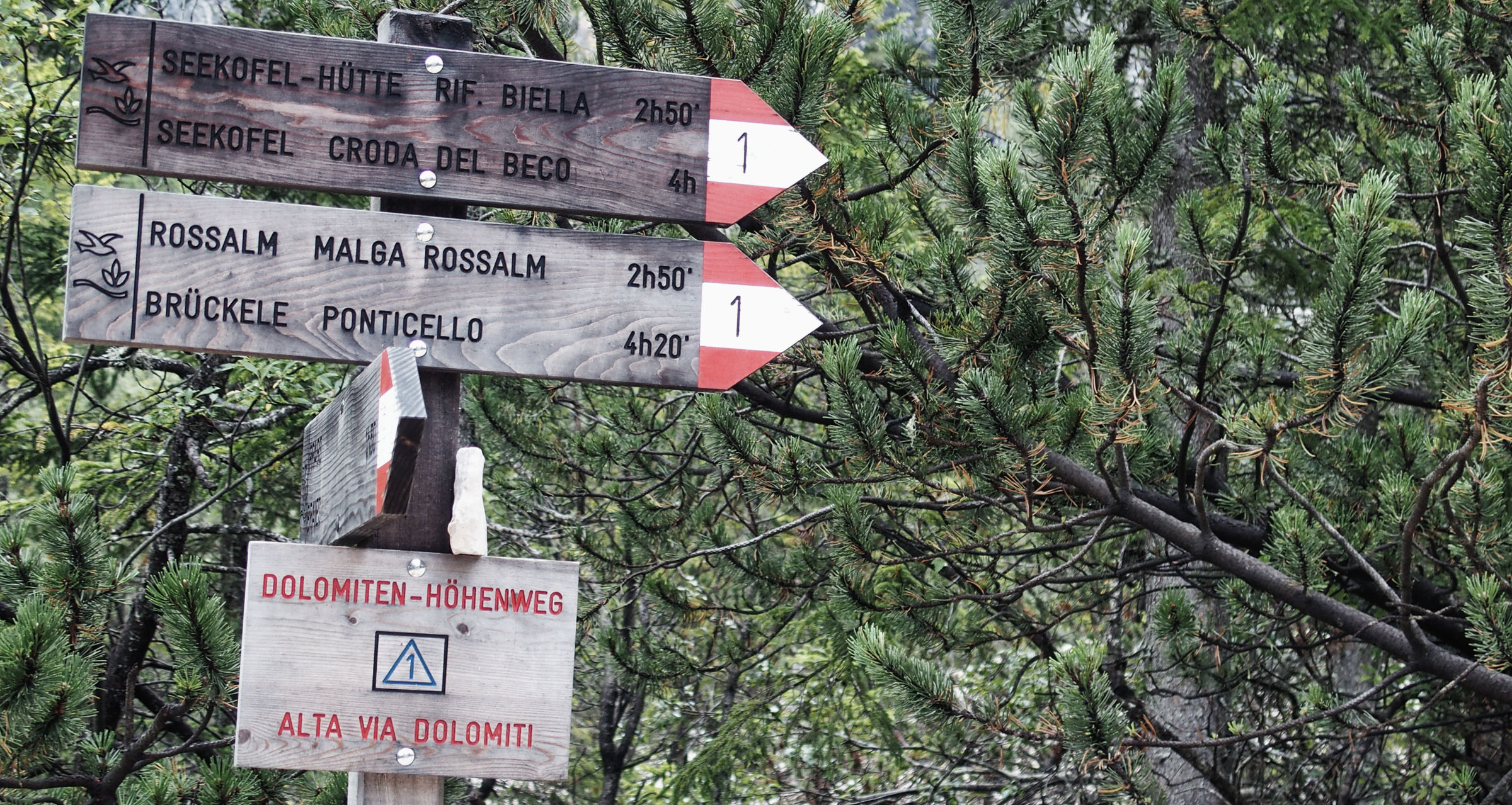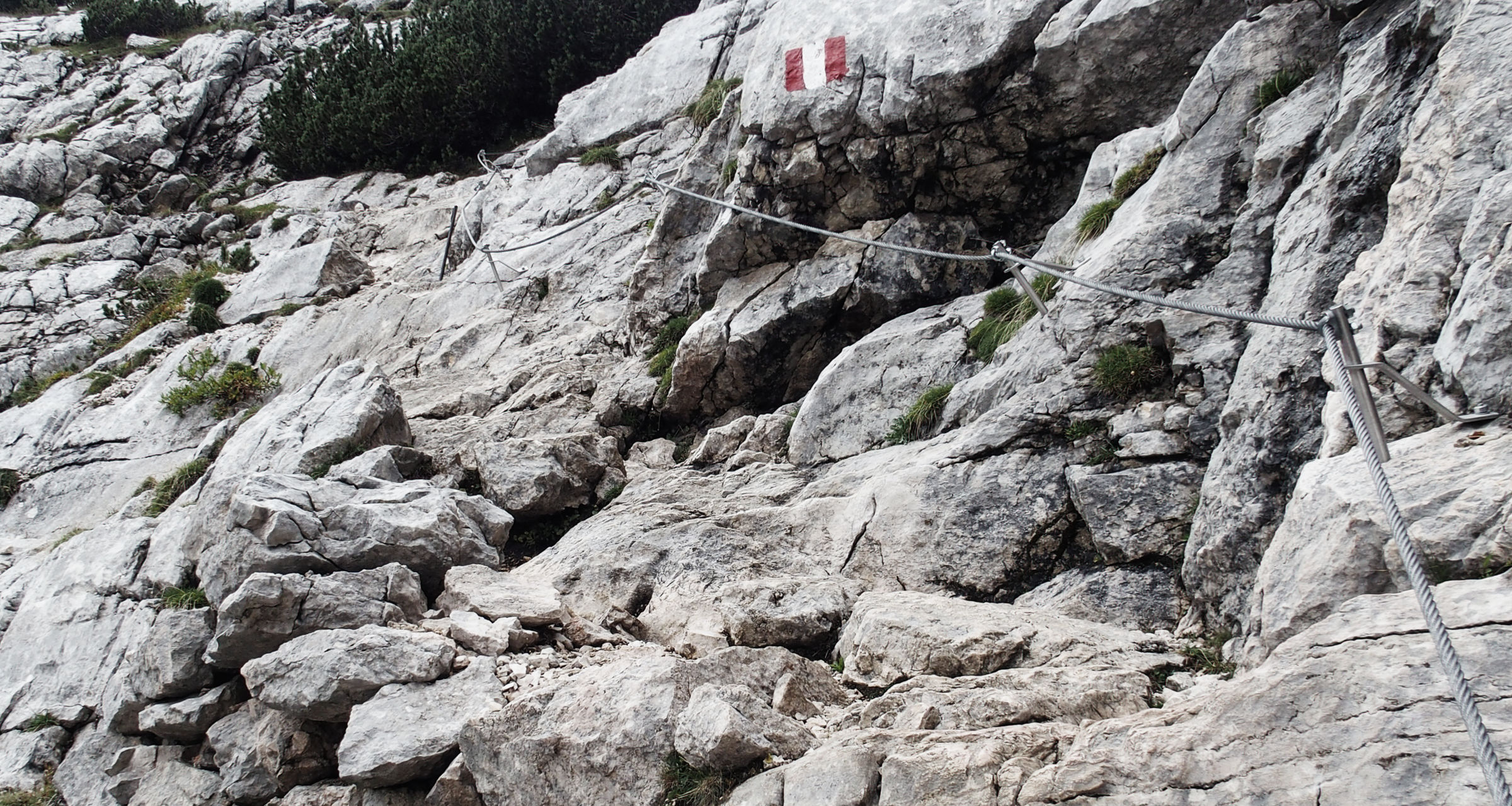 Ein Italiener fragt mich beim überholen, ob ich zum Croda del Becco möchte. Ich sage nein, zum Seekofel. Einige Minuten später sind wir uns einig – auf italienisch heißt der Seekofel einfach Croda del Becco, wer hätte das vermutet (naja, jeder der den Wegweiser besser gelesen hätte zumindest…)! Dieses Problem hatte ich in Südtirol schon häufiger, es gibt eigentlich immer einen italienischen und einen deutschen Namen, oftmals ist die Bedeutung eine ganz andere. Der Italiener „rennt“ voraus und ich genieße die rauen Berge, ab und an etwas ausgesetzt und drahtseilversichert.