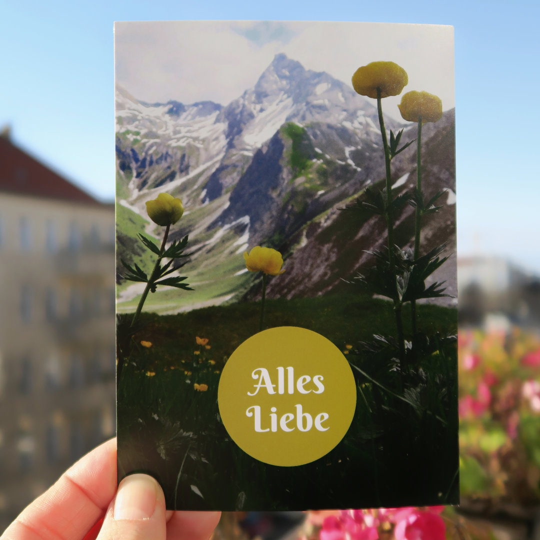 Wünsche deinne Liebsten „Alles Liebe“ zu Ostern mit diesem bergigen Gruß. Schicke der besten aller Mütter alles Liebe zum Muttertag oder zum Geburtstag. Versende ein bisschen Berge und fröhliche Farben zur Hochzeit, zum Geburtstag, zur Geburt, Taufe oder zur Kommunion. Oder schicke einfach einen lieben Gruß an deine liebsten Bergmenschen und zeige, dass du an sie denkst.