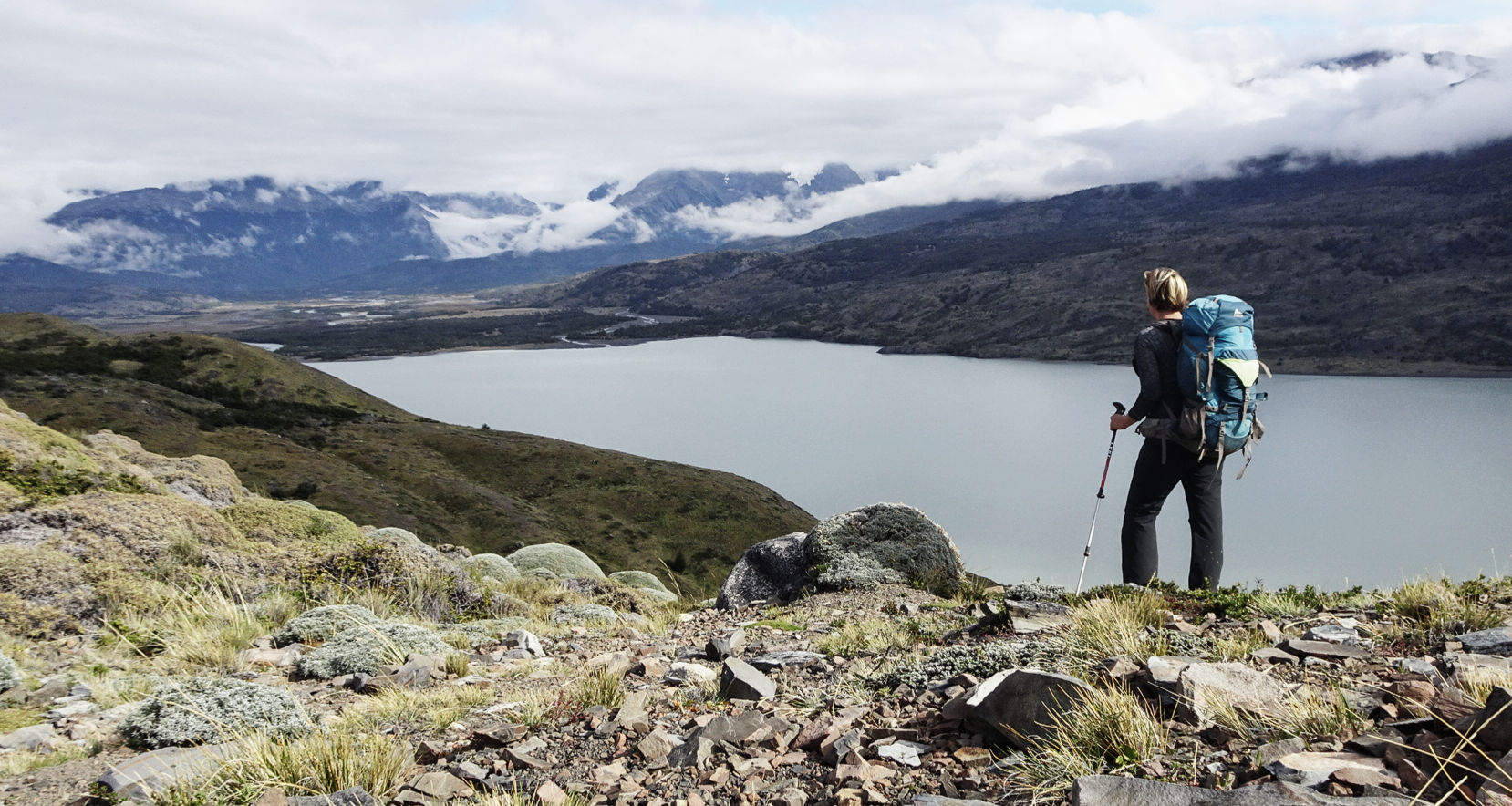 Aber heute soll es ja noch einiges weiter gehen, daher mache ich mich bald wieder auf. Ein kleiner Anstieg wird wieder belohnt mit tollem Ausblick auf den See und die Berge. Teilweise immer noch versteckt hinter den Wolken, aber der Himmel klart auf. In der Sonne ist es jetzt ziemlich warm und ich genieße die Wanderung. Coiron ist als nächste Wegmarkierung in meiner Karte markiert, es gibt Toiletten und meinen ersten Rangerkontakt. Ich muss mich in einem Buch einschreiben und meine Buchung für den nächsten Campingplatz zeigen. Einige andere Wanderer sitzen erschöpft herum oder behandeln Blasen. Es sind nur noch 9 relativ flache Kilometer bis zu meinem Campingplatz und ich fühle mich fit. Die Kondition, die ich mir in den letzten Monaten aufgebaut habe macht sich wieder bezahlt. Ich kann jetzt sogar in meinem Tshirt wandern, da es so warm ist. Die Aussicht wird immer besser, Gletscher, Berge, Schnee, Flüsse … Traumhaft!