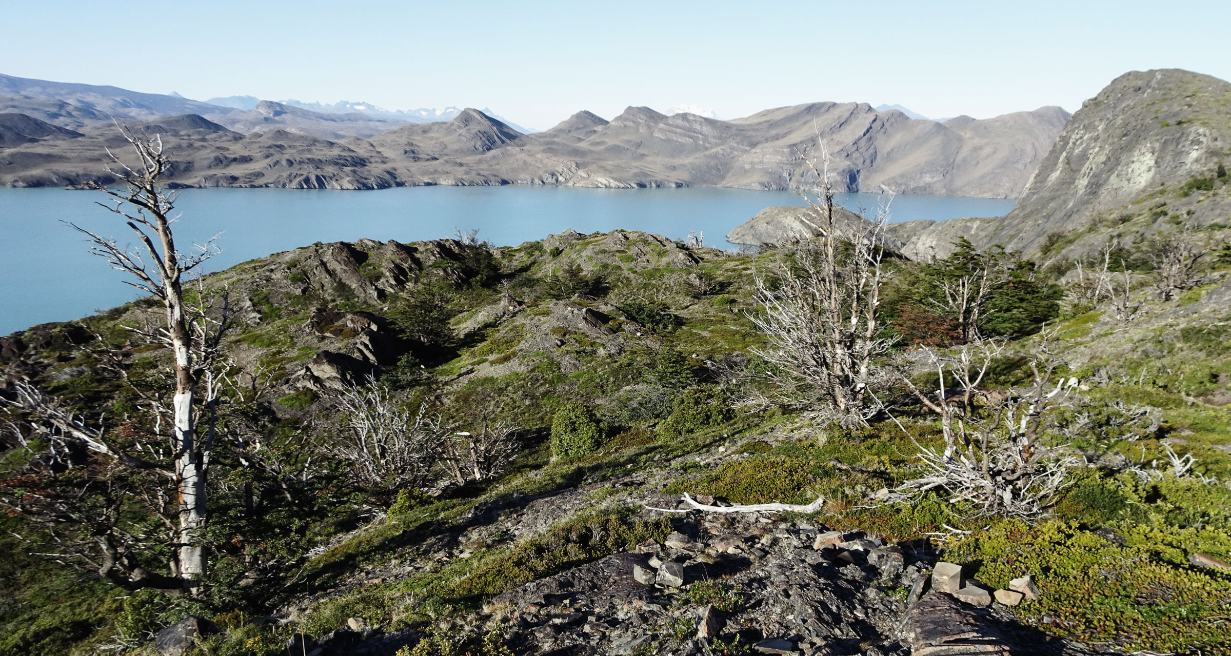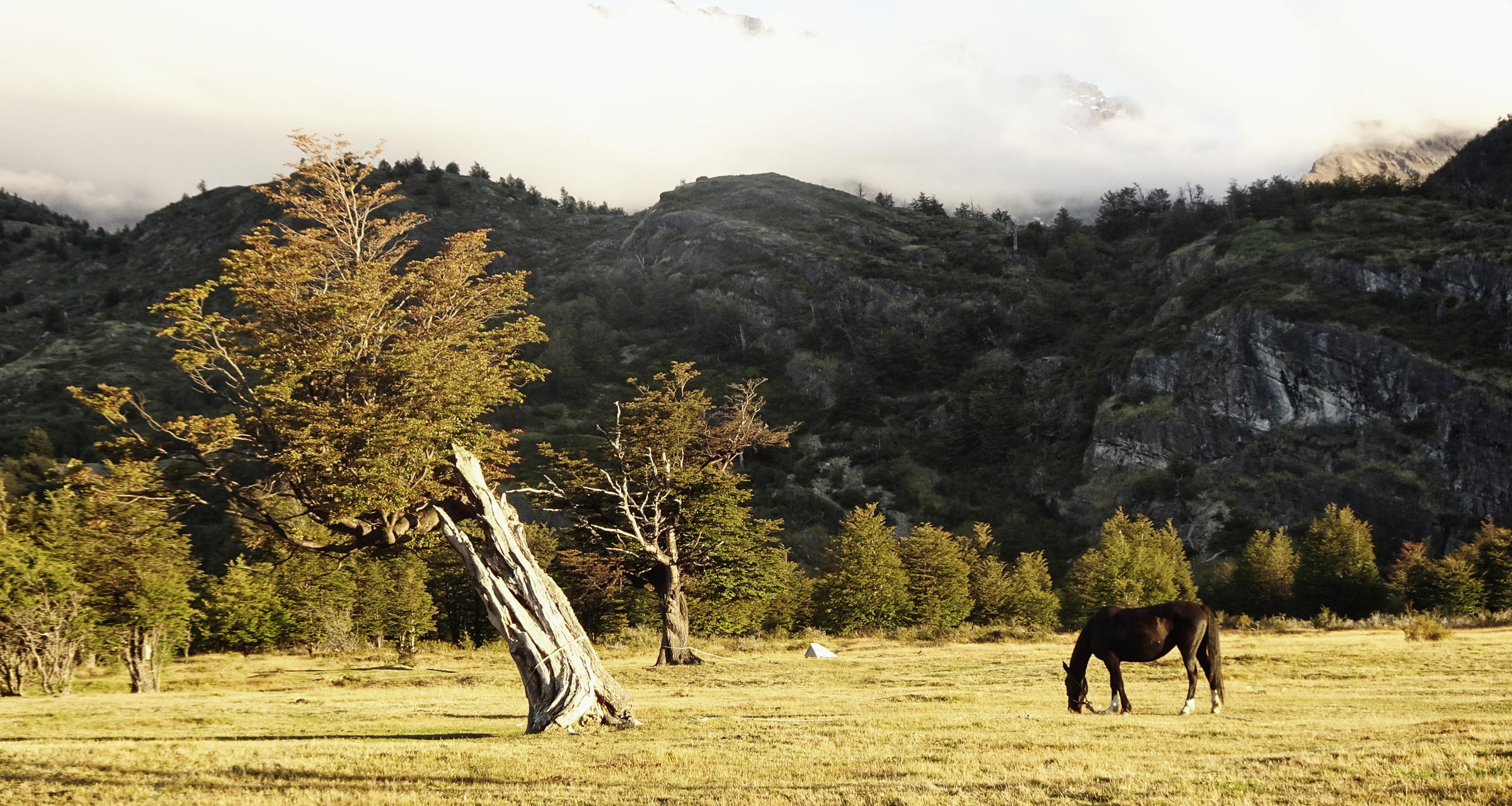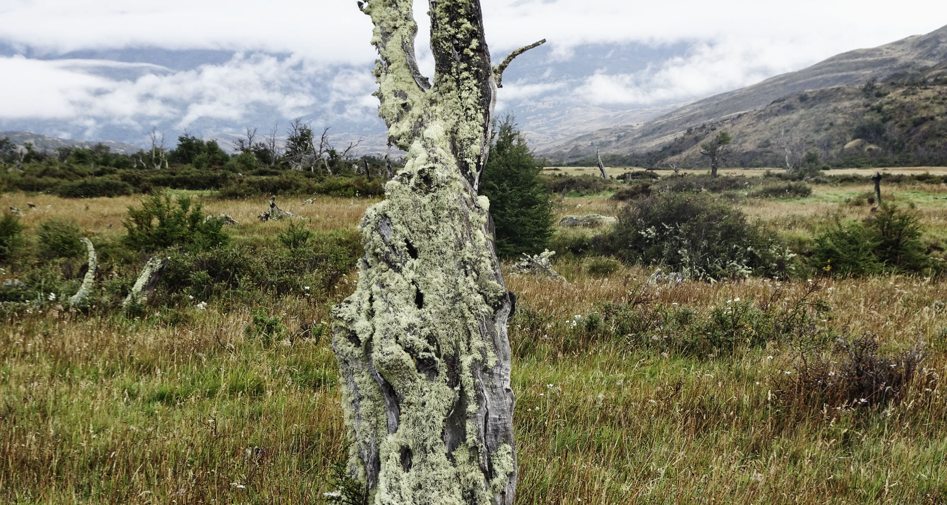 Die ganze Nacht höre ich den Gletscher knacken, auch heute geht es bereits vor 8h im dunklen nebligen Morgen los. Die erste Stunde führt mich entlang der Laguna Grey mit schöner Aussicht zurück zum Gletscher bevor es durch hügeliges Gelände mit toten Bäumen geht. Vor 10 Jahren hat hier ein großflächiger Waldbrand alles kaputt gemacht. Von Menschenhand verursacht. Traurig. Weiter geht’s durch ein schönes kleines Tal und plötzlich sehe ich bereits die große Paine Grande Lodge.