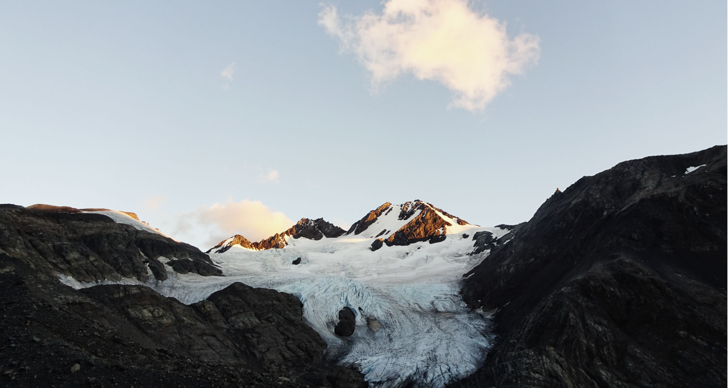 Gegen 16 Uhr erreichte ich den Campingplatz Dickson. Ich baue mein Zelt auf damit es trocknet und genieße eine warme Dusche. Die Sonne kommt heraus und taucht den Zeltplatz in magisches Licht, auf der anderen Seite gibt es Blick auf einen Gletscher, ein wirklich perfekter Ort zum Zelten.