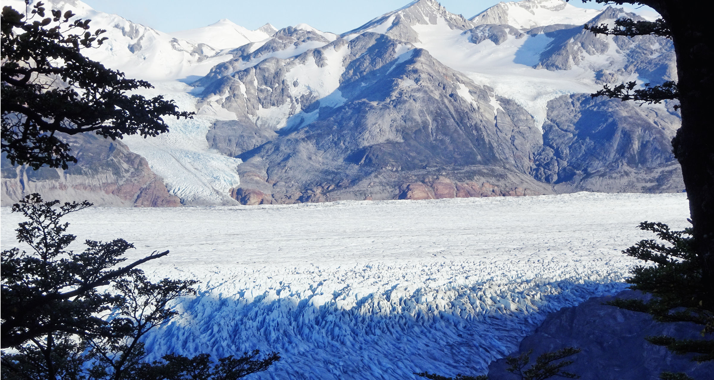 Die Ranger haben alle, die bis zur Grey Campsite wandern möchten dazu verpflichtet, um 7h morgens zu starten – da es angeblich 11h dauert die 22km zu wandern durch den hohen Pass (gerade mal 1200m hoch…). Für mich keine große Sache, aber da ich sowieso früh um 6h bereits wach bin nach einer schlechten Nacht, stehe ich auf under packe in der Dunkelheit. Sonenaufgang ist erst um 8h. Zum Glück regnet es nicht mehr, ich kann Sterne sehen soweit es der Wald zulässt. Es ist relativ schwer auf dem Weg zu bleiben in der Dunkelheit. Es ist auch viel wärmer als gedacht und schon bald schwitze ich auf meinem Weg nach oben. Nach einmal verlaufen und mühevollem zurückfinden auf den Weg (dank anderer Wanderer und deren Stirnlampen) bin ich endlich überhabld der Baumgrenze. Es dämmert, aber bis die Sonne über den Bergen ist dauert es sicherlich noch länger. Der Weg ist jetzt leicht zu finden und der Tag perfekt, kaum Wolken, kein Wind. Ich bin mal wieder ein Glückskind, meistens regnet und stürmt es hier oben. Stattdessen bewundere ich den Sonnenaufgang und das Bergglühen und bin schon bald am Pass, nach nur 2h wandern. Wow. Damit habe ich nicht gerechnet. Vor mir ist alles weiß, türkis, blau. Der riesige Gletscher Grey breitet sich unter mir im Tal aus. Es ist atemberaubend schön, so ganz anders als alles was ich bisher gesehen habe. Der Gletscher muss kilometerlang sein, ich kann sehen wie er in den Grey See kalbt und sich auf der anderen Seite bis hoch in die Berge zieht. Nach meiner Enttäuschung an den Torres del Paine bin ich nun doch sehr glücklich, den Q-Circuit zu wandern. Hier ist auch kaum jemand unterwegs, der Weg wird auf 80 Personen pro Tag limitiert und die meisten sind noch nicht am Pass.
